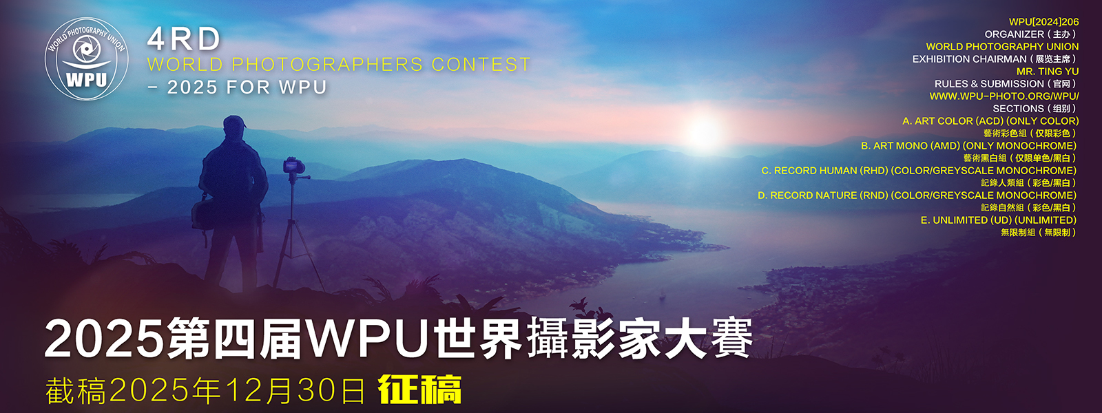 6th 360° CIRCUIT FOR GLOBAL PHOTOGRAPHY 2025 由503 Photography Club主办,晶宸摄影(JCPC)协办,世界摄影联盟(WPU[2025]165)认证的2025第六届360度全球摄影巡回赛揭晓,本大赛共设有艺术彩色组(ACD) 、艺术黑白组(AMD)、记录人类组(RHD) 、记录自然组(RND)、无限制组(UD) 5个组别和3个沙龙,中国摄影师参赛的作品共获得68个奖项、1314幅入围的成绩,在此特向入围作者表示热烈祝贺! 其中503俱乐部荣获7金1银1铜19优,自由行俱乐部荣获5金3银1铜4优,其他中国摄影师荣获9金5银3铜10优,本赛事的所有成绩将自动计入“国际摄影十杰”年度评选积分(享受优惠待遇的成绩除外),同时在这次比赛中没有作品入围的摄影师可以享受晶宸优惠待遇(有效期一年),自动获得免费投稿由晶宸主办的下一次国际沙龙的机会,或选择一次由晶宸代理的国际沙龙(免代理费,只需支付报名费)参赛投稿。中外获奖作品选登艺术彩色组WPU金牌:张玉华/中国/《Populus euphratica》WPU金牌:Andrey Ustinovich/俄罗斯/《My friend-3》WPU金牌:陈龙洋/中国/《Colorful settlement 11》SALON电子证书金奖:Bekir Yesiltas/土耳其/《ipekunderground》SALON电子证书银奖:Liliya Kovalenko/俄罗斯/《At the piano》SALON电子证书银奖:Liliya Kovalenko/俄罗斯/《Beautiful Tatiana-2》SALON电子证书银奖:LING JYI CHAO/中国台湾/《TWT 02》SALON电子证书铜奖:Andrey Ustinovich/俄罗斯/《Old military pillbox-3》SALON电子证书铜奖:Bekir Yesiltas/土耳其/《ColorMisra》SALON电子证书铜奖:Bekir Yesiltas/土耳其/《Dijitaltime2025》艺术黑白组WPU金牌:woodpecker huang/中国台湾/《makeup net in rain》WPU金牌:LING JYI CHAO/中国台湾/《Brothers》WPU金牌:YAN WONG/中国/《Going Canada》SALON电子证书金奖:Liliya Kovalenko/俄罗斯/《Bright holiday》SALON电子证书金奖:张玉华/中国/《Cattle Team on the Snow》SALON电子证书金奖:罗原光/中国/《Crack Walker》SALON电子证书银奖:张玉华/中国/《Building Reflections》SALON电子证书银奖:Tim Sanders/英国/《Airbourne Motorbatics》SALON电子证书银奖:Bekir Yesiltas/土耳其/《SokullumehmetPasaBWZF》SALON电子证书铜奖:Bekir Yesiltas/土耳其/《FlyBW》SALON电子证书铜奖:陈龙洋/中国/《Fireworks bloom in full bloom 17》SALON电子证书铜奖:Tim Sanders/英国/《Red Arrows Split》记录人类组WPU金牌:LING JYI CHAO/中国台湾/《Ribbon dance 55》WPU金牌:马伟华/中国/《make obeisance》WPU金牌:陈龙洋/中国/《Red and White Symphony 3》SALON电子证书金奖:Liliya Kovalenko/俄罗斯/《Victory Parade》SALON电子证书金奖:张玉华/中国/《Heaven and Earth》SALON电子证书金奖:woodpecker huang/中国台湾/《Bull run》SALON电子证书银奖:Liliya Kovalenko/俄罗斯/《In the abode of Buddha》SALON电子证书银奖:张玉华/中国/《take pleasure in it》SALON电子证书铜奖:LING JYI CHAO/中国台湾/《Fight hard 1》SALON电子证书铜奖:Bekir Yesiltas/土耳其/《1Mayisportresi》SALON电子证书铜奖:Vincenzo Di Panfilo/意大利/《Tombstones》记录自然组WPU金牌:Vincenzo Di Panfilo/意大利/《Sossusvlei》WPU金牌:woodpecker huang/中国台湾/《Robotfly 12》WPU金牌:Bekir Yesiltas/土耳其/《Cekirge2》SALON电子证书金奖:LING JYI CHAO/中国台湾/《STM 05》SALON电子证书金奖:马伟华/中国/《Tilt head and observe》SALON电子证书金奖:woodpecker huang/中国台湾/《Ant rescue》SALON电子证书银奖:woodpecker huang/中国台湾/《HUNTING 05》SALON电子证书铜奖:Tim Sanders/英国/《Almost Hidden》SALON电子证书铜奖:Chris Whitty/英格兰/《Homeward bound》SALON电子证书铜奖:张玉华/中国/《observe》无限制组WPU金牌:张玉华/中国/《Traces of nature》WPU金牌:雷放/中国/《Snowtop Wilderness 7》WPU金牌:Chris Whitty/英格兰/《The Challenge》SALON电子证书金奖:Vincenzo Di Panfilo/意大利/《Pyramids》SALON电子证书金奖:LING JYI CHAO/中国台湾/《Seda 01》SALON电子证书金奖:Bekir Yesiltas/土耳其/《Tiltlight》SALON电子证书银奖:woodpecker huang/中国台湾/《rain ladybug A》SALON电子证书银奖:张玉华/中国/《Painting on the Wall》SALON电子证书铜奖:LING JYI CHAO/中国台湾/《LHT 01》SALON电子证书铜奖:Chris Whitty/英格兰/《Catch of the day 3》SALON电子证书铜奖:LING JYI CHAO/中国台湾/《TLS 01》晶宸代理参赛作品入围统计: 安百平 The Joy of Childhood 1 无限制组 入围 安百平 The Joy of Childhood 12 艺术黑白组 入围 安百平 The Joy of Childhood 2 无限制组 入围 安百平 The Joy of Childhood 2 无限制组 入围 安百平 The Joy of Childhood 3 无限制组 入围 安百平 The Joy of Childhood 4 无限制组 入围 安百平 The Joy of Childhood 4 无限制组 入围 安百平 The Joy of Childhood 5 记录人类组 入围 安百平 The Joy of Childhood 8 记录人类组 入围 安百平 The Joy of Childhood 8 记录人类组 入围 安百平 zacco platypus 5 记录自然组 入围 安百平 zacco platypus 6 记录自然组 入围 安百平 zacco platypus 7 记录自然组 入围 白树和 Former Residence of Chairman Mao 21 艺术黑白组 入围 白树和 Former Residence of Chairman Mao 22 艺术黑白组 入围 白树和 Former Residence of Chairman Mao 23 艺术黑白组 入围 白树和 Former Residence of Chairman Mao 23 艺术黑白组 入围 白树和 Former Residence of Chairman Mao 23 艺术黑白组 入围 白树和 Play with the baby 4 无限制组 入围 白树和 Play with the baby 4 无限制组 入围 白树和 Thai crucian carp 3 记录自然组 入围 白树和 Thai crucian carp 5 记录自然组 入围 白树和 Thai crucian carp 6 记录自然组 入围 白树和 Watchman by the Well 1 无限制组 入围 白树和 Watchman by the Well 3 记录人类组 入围 白树和 Watchman by the Well 3