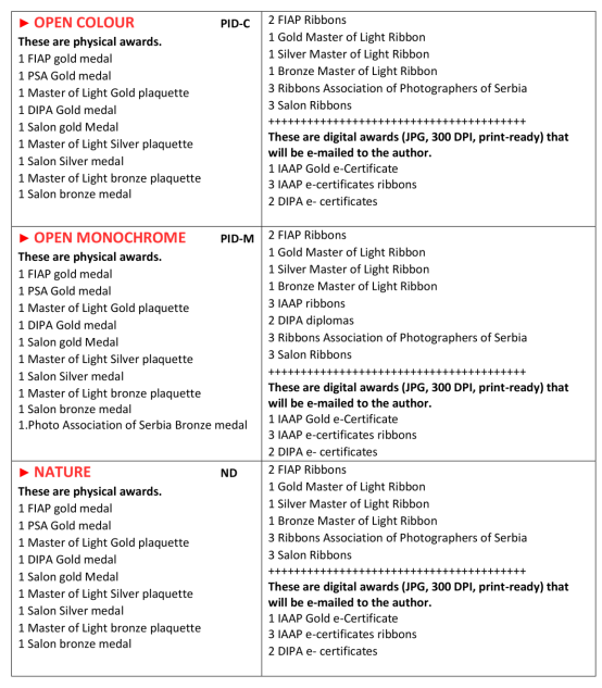 1、PSA、FIAP、MoL、DiPA、IAAP、FSS、AFS、BG金牌、银牌、铜牌、勋带奖及各种荣誉奖等