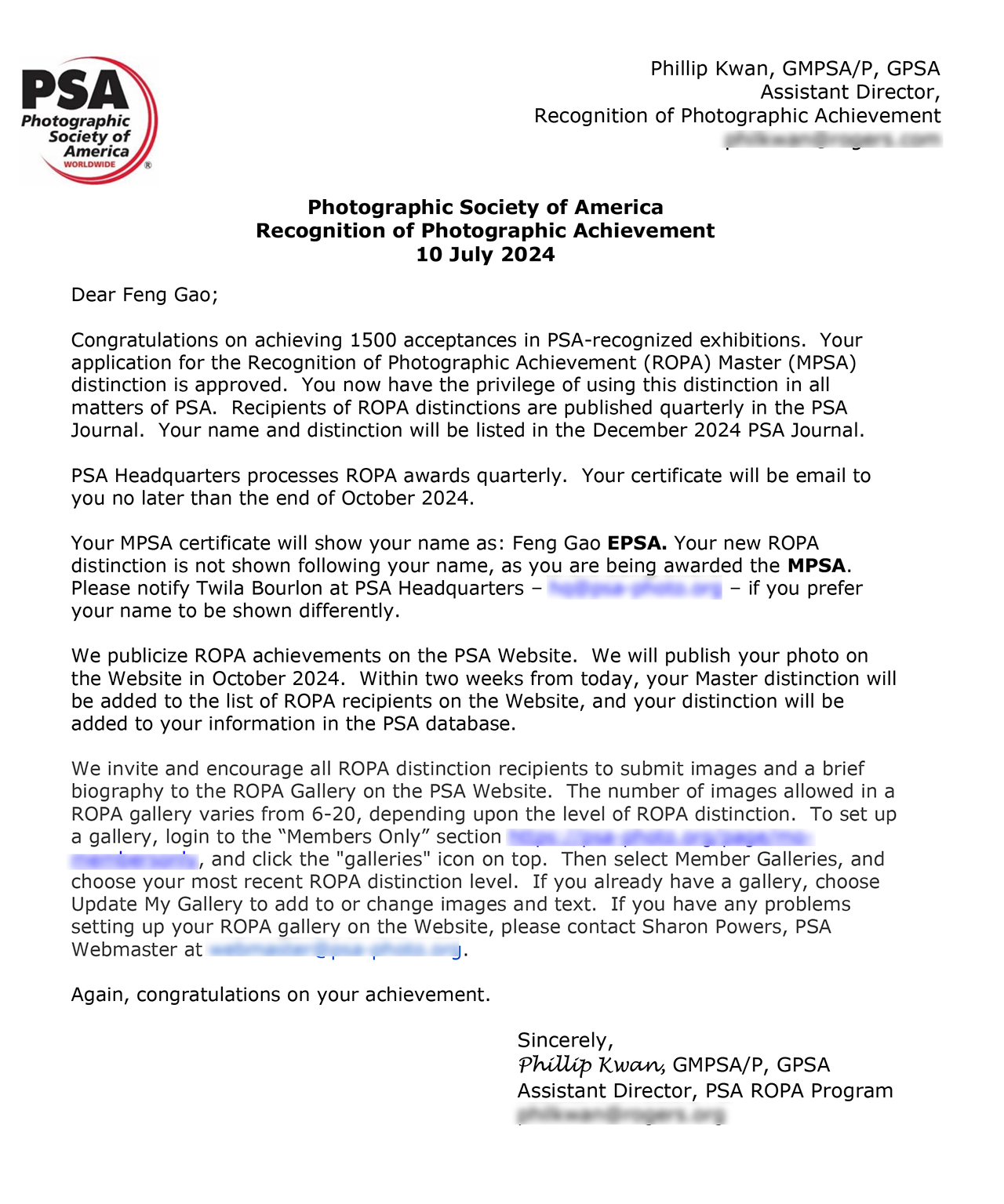 2024年7月10日,美国摄影学会(PSA)高峰(会员编号:69285974)老师接到PSA通知,其申报的MPSA国际摄影名衔已获正式批准,自即日起生效,今后在国际事务交流或联络中,其姓名后可合法加上这个权威的国际摄影名衔的英文字符,如:Feng Gao,MPSA。