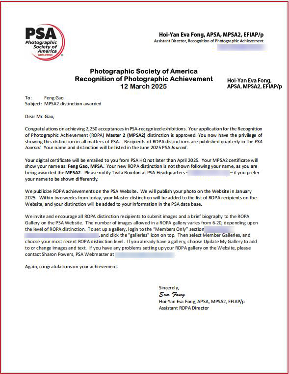 2025年3月12日,美国摄影学会(PSA)高峰(会员编号:69285974)老师接到PSA通知,其申报的MPSA2国际摄影名衔已获正式批准,自即日起生效,今后在国际事务交流或联络中,其姓名后可合法加上这个权威的国际摄影名衔的英文字符,如:Feng Gao,MPSA2。