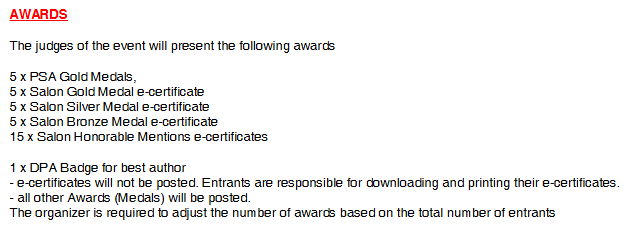 4、所有参赛者的有效成绩,都将被纳入全球 PSA 摄影名人录中的 PSA 星级评定名单,并可申请获得 PSA 的荣誉和名衔。
