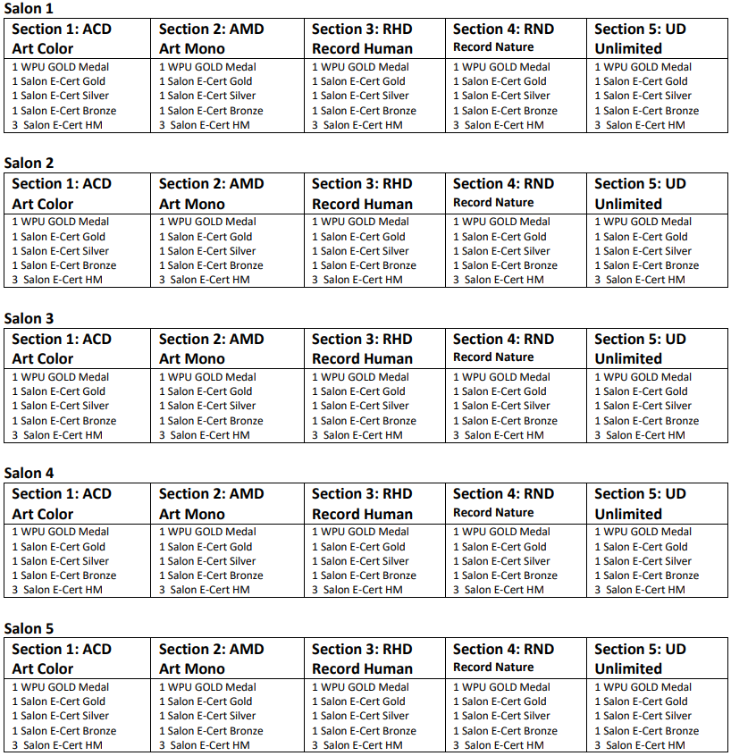 四、沙龙 / 组别 5 X 5(即该巡回赛一次投稿就可以同时参赛5个沙龙,每个沙龙有相同的5个组别,每组限投4幅,但同一作品不得重复投稿)