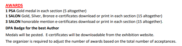 1、PSA、SALON金牌、银牌、铜牌、勋带奖及各种荣誉奖等
