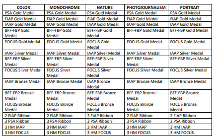 1、PSA、FIAP、IAAP金牌、银牌、铜牌、勋带奖及各种荣誉奖等