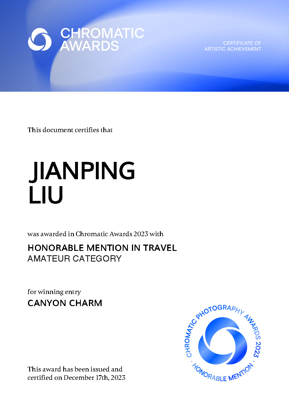 2023国际彩色摄影奖揭晓,由晶宸代理投稿参赛的中国摄影师刘建平作品:峡谷魅力(id 23/18204)荣获旅行荣誉奖!在此特向获奖作者表示热烈祝贺!